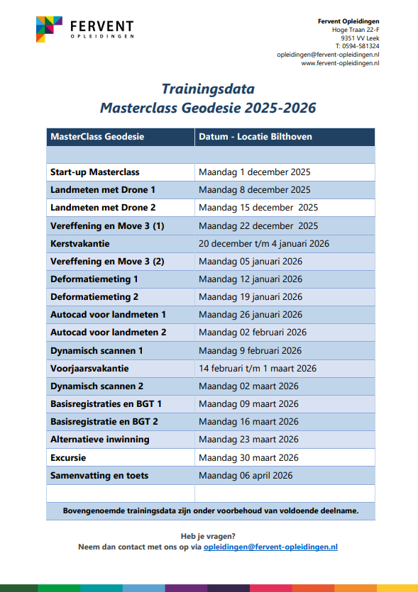 Deze opleiding is het logische vervolg van de Opleiding Geodesie in de Praktijk, maar is zo ontwikkeld dat iedereen met de nodige basiskennis en landmeetkundige vaardigheden kan meedoen.